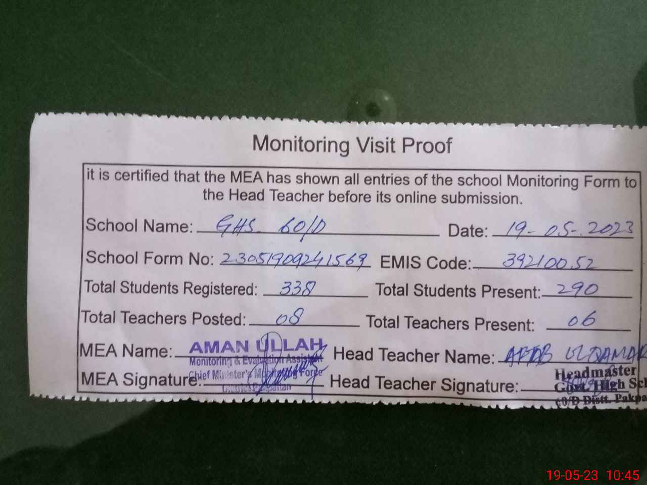 | EMIS Code: 39210052 | Name of School: GHS 60/D P/O CHAK BADIA | |||