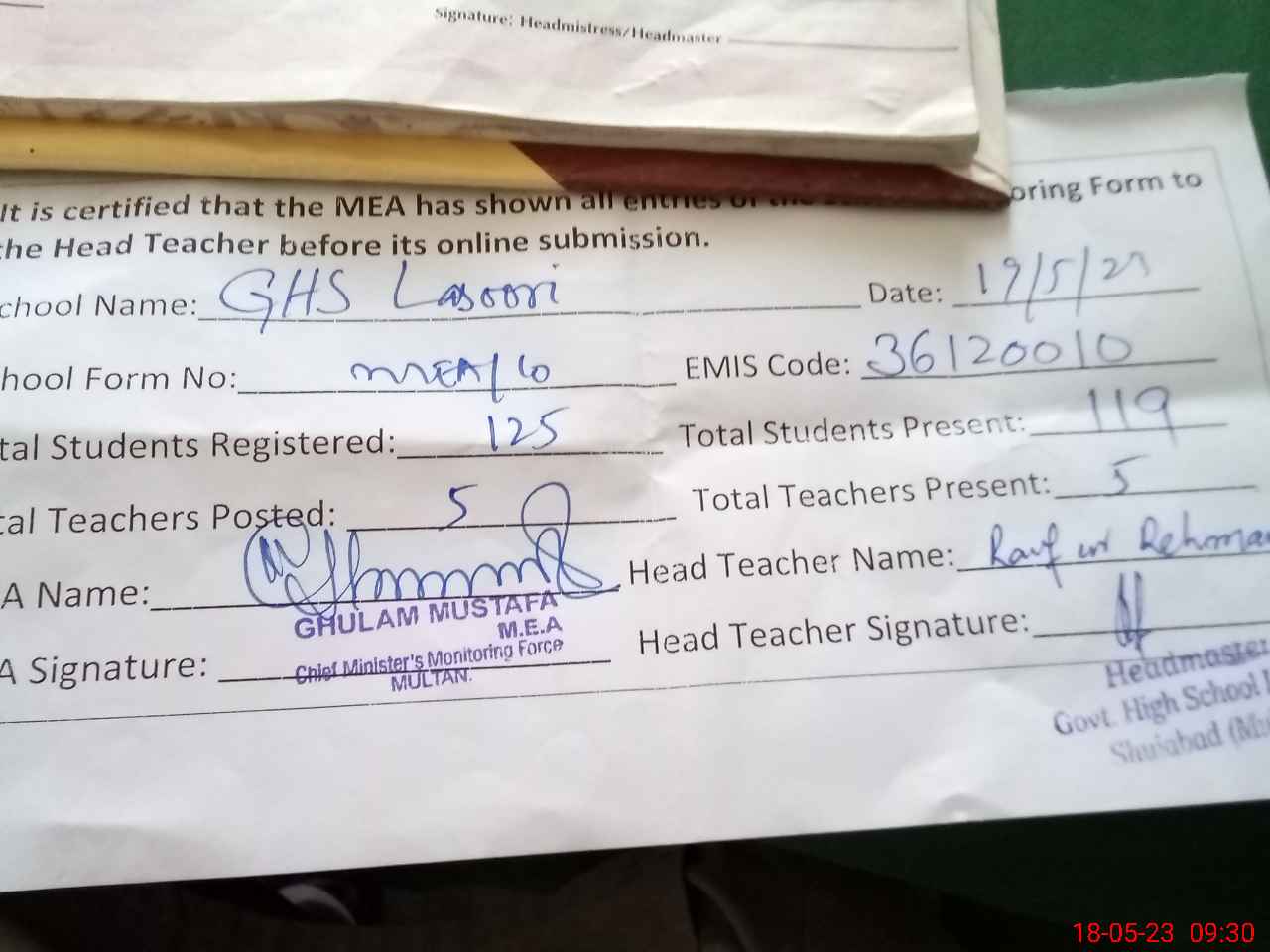 | Attendance Register | Head Teacher | MEA with School | Visit Proof |