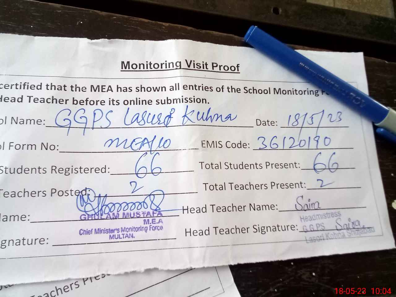 | Attendance Register | Head Teacher | MEA with School | Visit Proof |