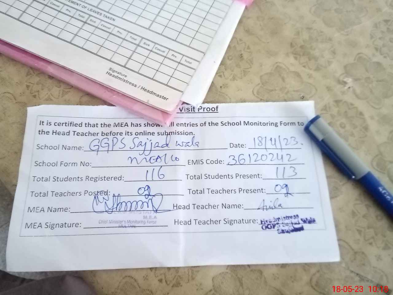 | Attendance Register | Head Teacher | MEA with School | Visit Proof |