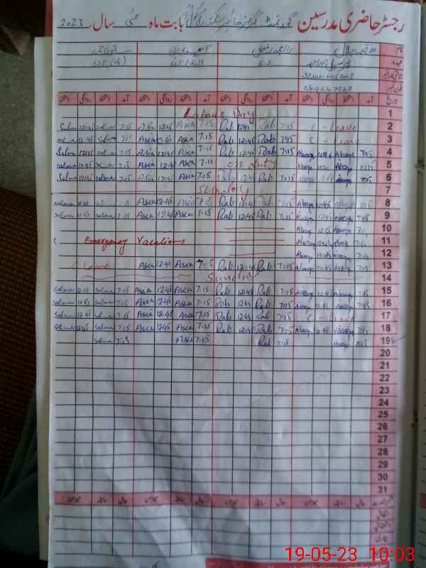 | Total no. of Classrooms: 18 No. of Classrooms Used for Teaching: 13 No. of Classrooms Storing Old Furniture, FTBs, etc: 0Comments if Any: SST Arshia Naz and Perveen Akhtar were absent during visit leave record was not available of both teachers and Madam Attiqa halal not signed visit proof |