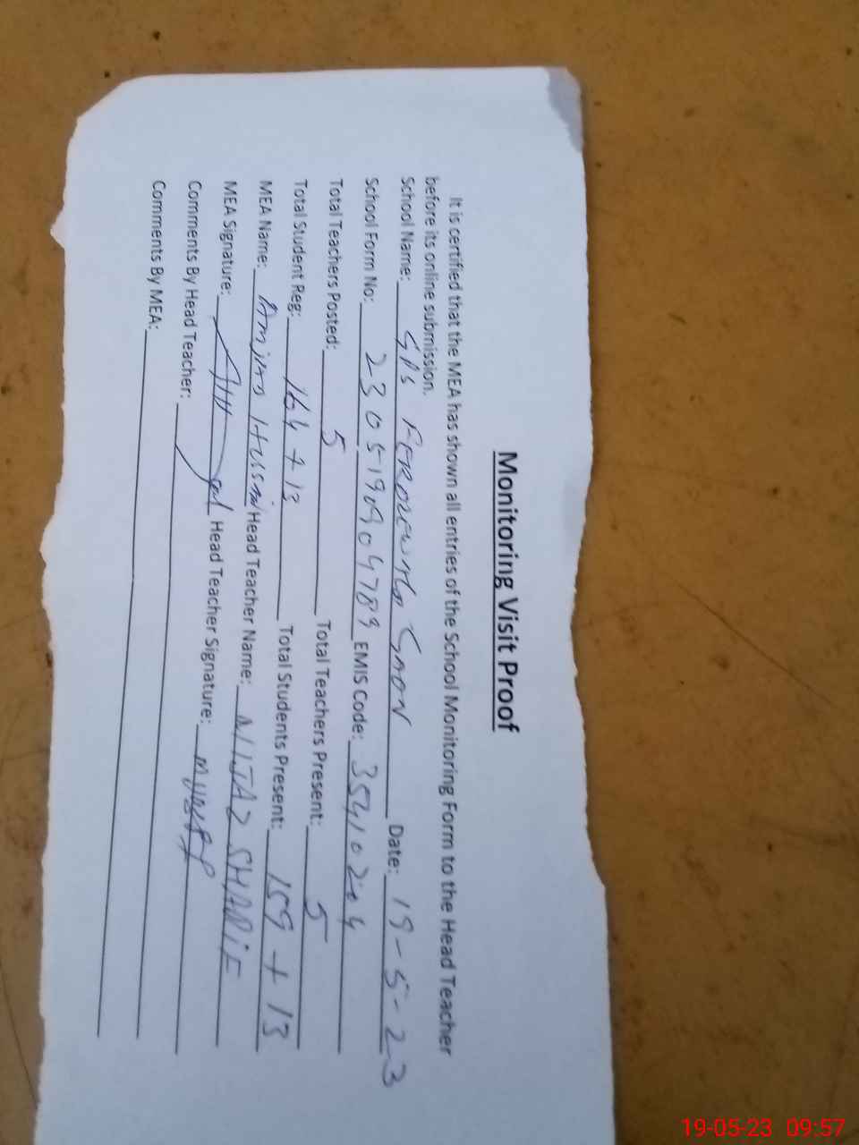 | Attendance Register | Head Teacher | MEA with School | Visit Proof |