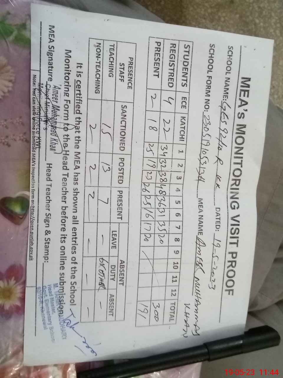 | Attendance Register | Head Teacher | MEA with School | Visit Proof |