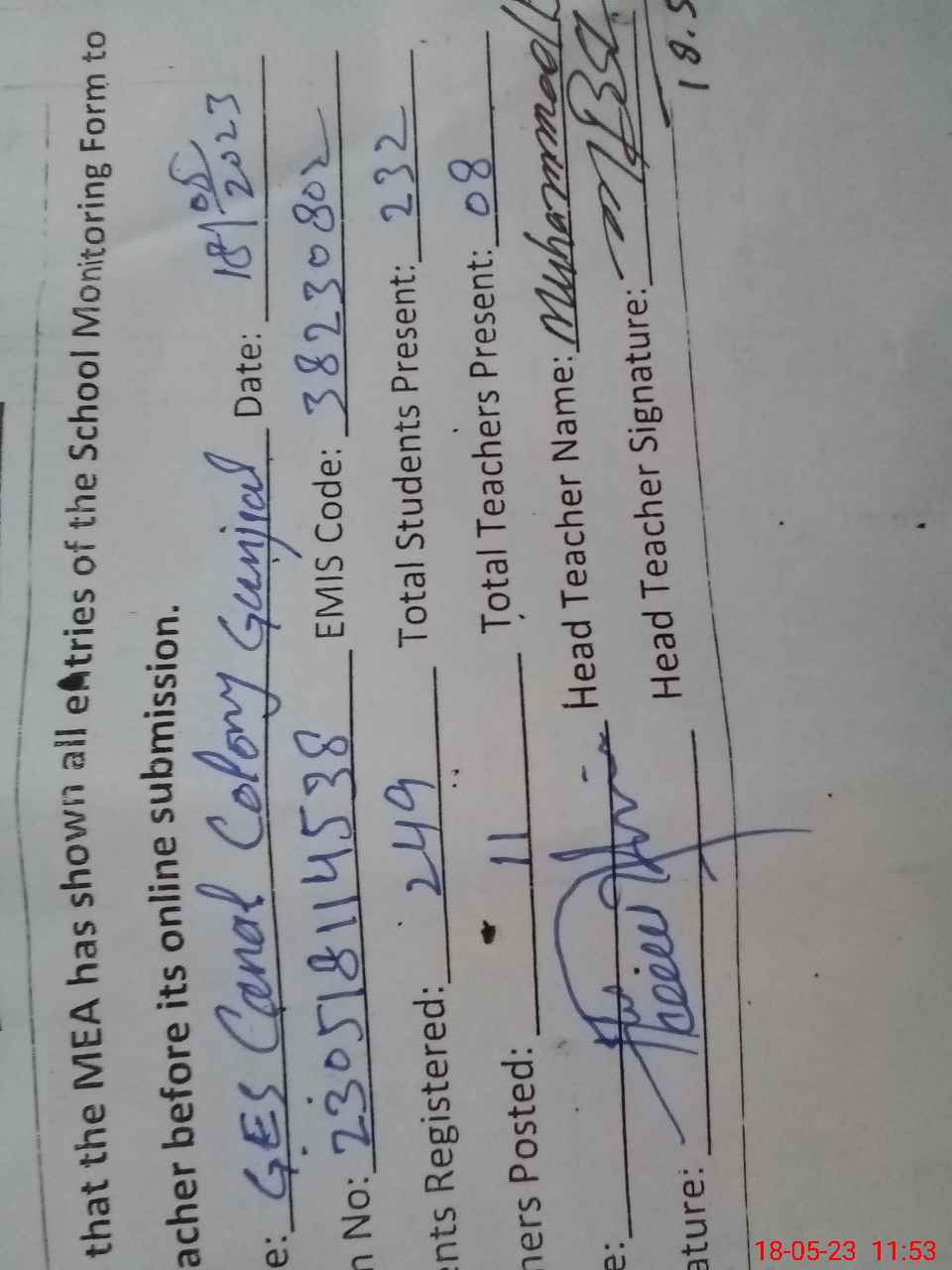 | EMIS Code: 38230802 | Name of School: GES CANAL COLONY GUNJIAL | |||