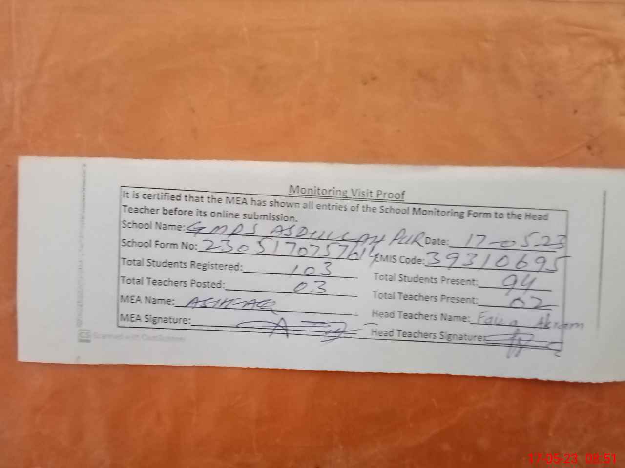 | Attendance Register | Head Teacher | MEA with School | Visit Proof |