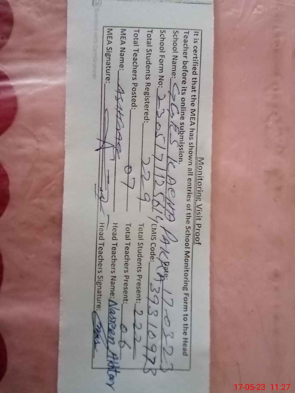 | Attendance Register | Head Teacher | MEA with School | Visit Proof |