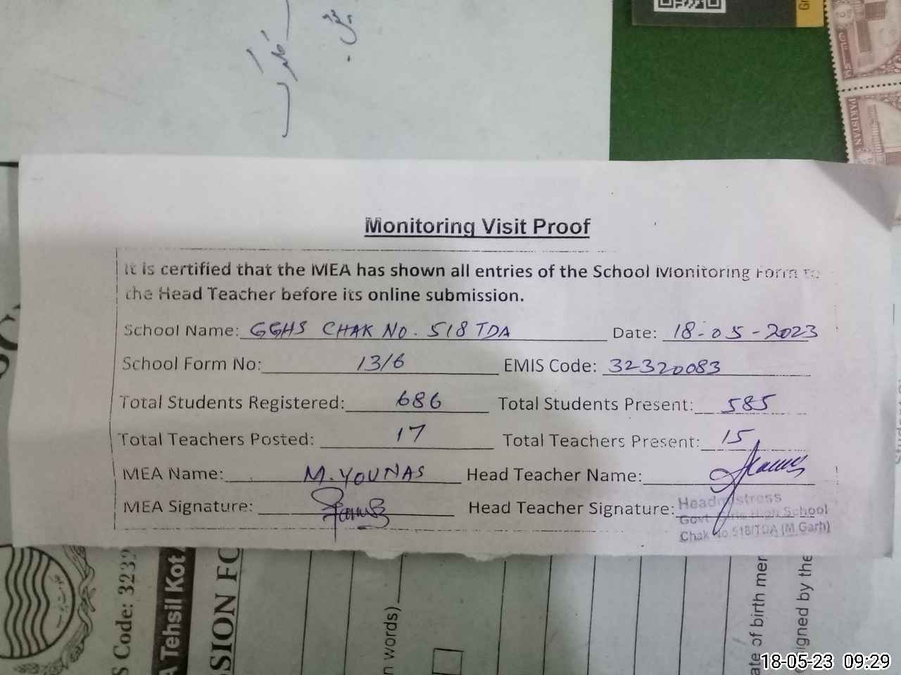 | EMIS Code: 32320083 | Name of School: GGHS CHAK NO. 518/TDA | |||