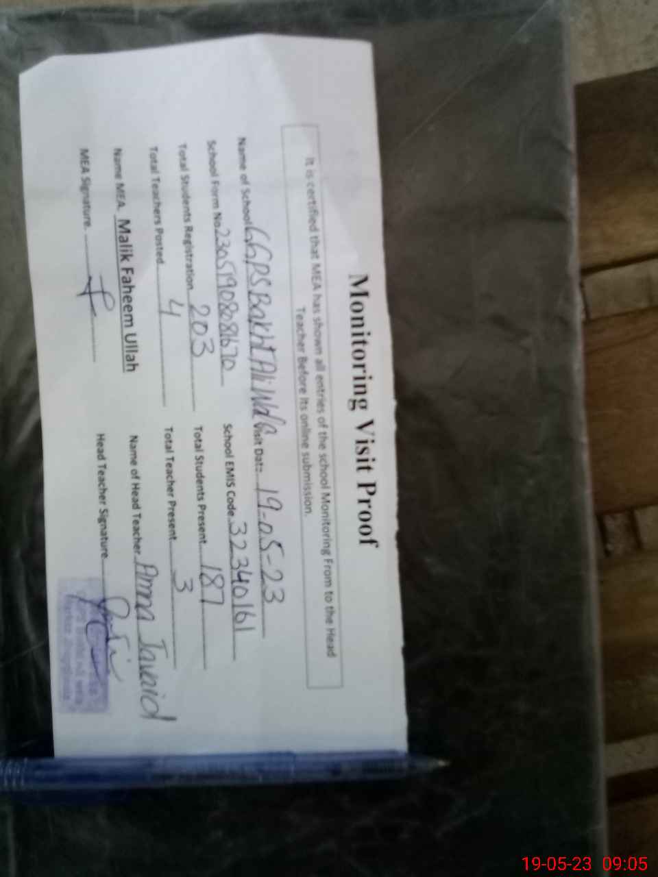 | Attendance Register | Head Teacher | MEA with School | Visit Proof |