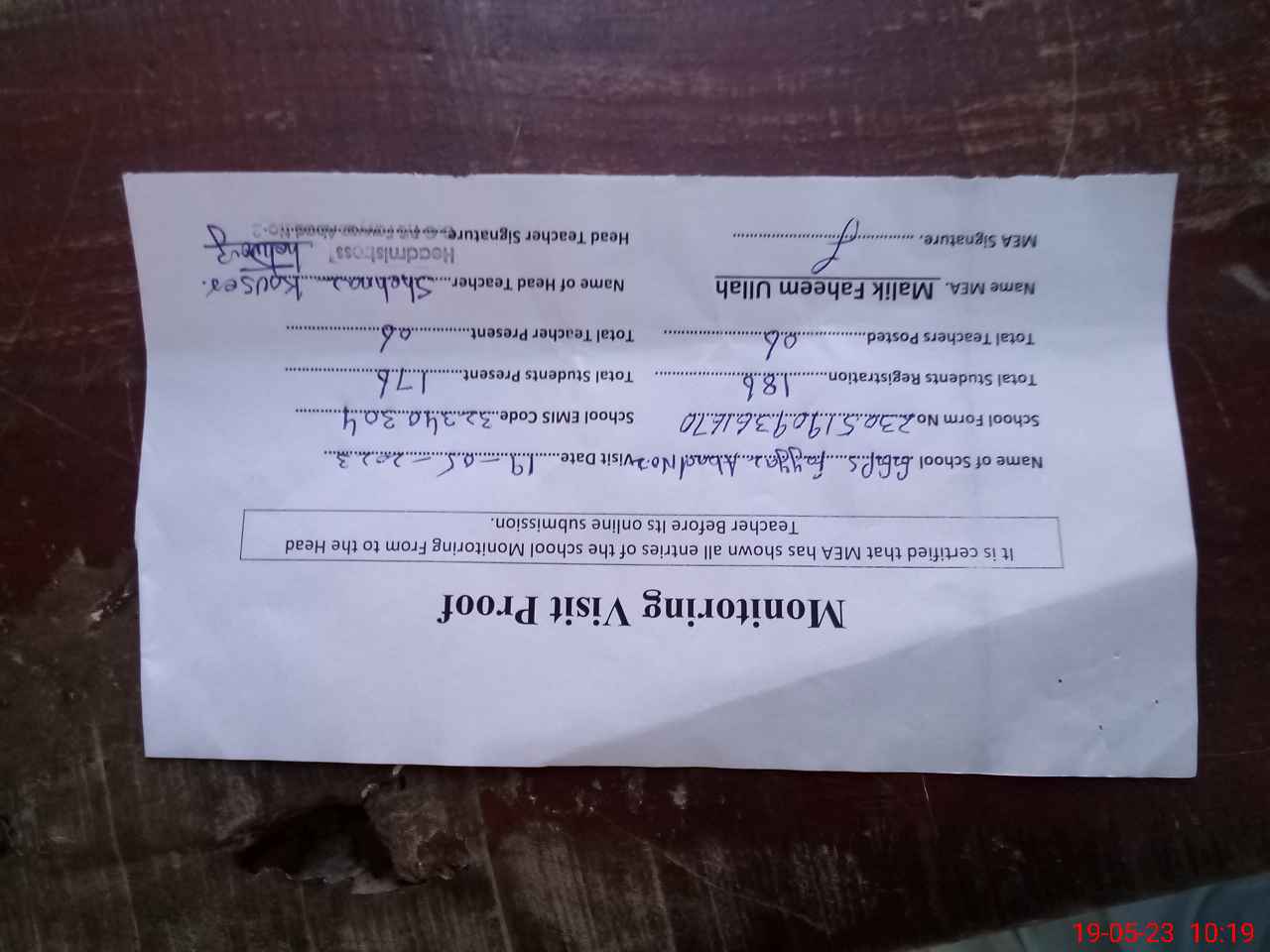 | Attendance Register | Head Teacher | MEA with School | Visit Proof |
