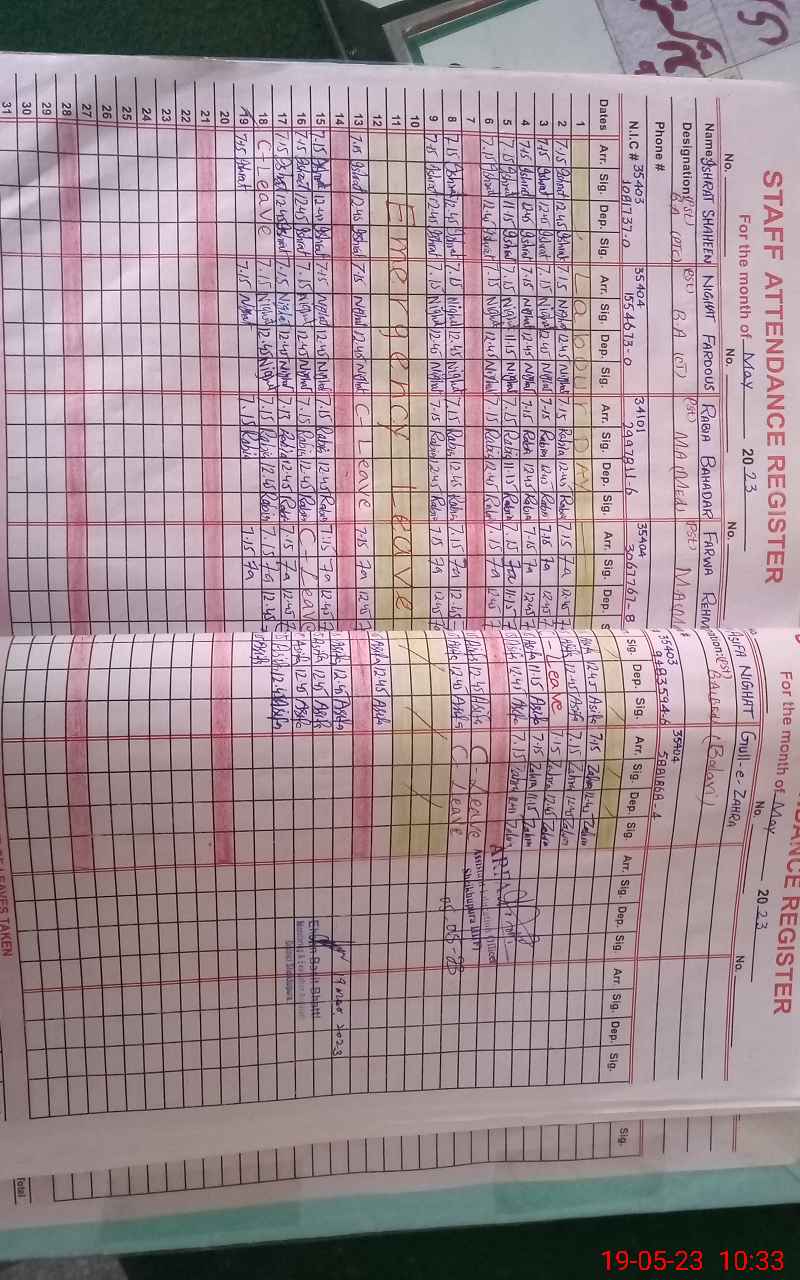 | CNIC | Full Name | Designation | R/C | Absence During Last Calender Month |