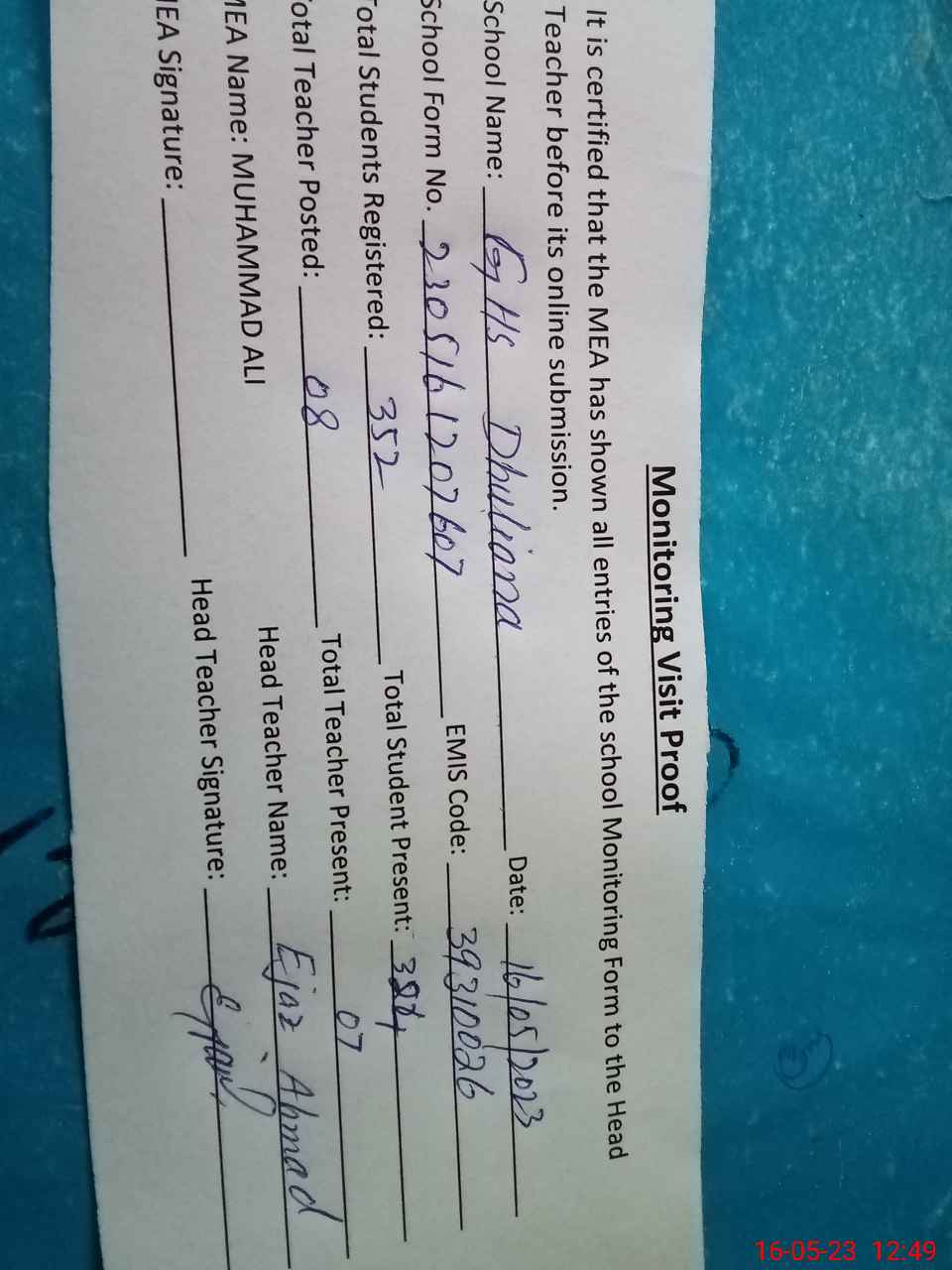 | Attendance Register | Head Teacher | MEA with School | Visit Proof |
