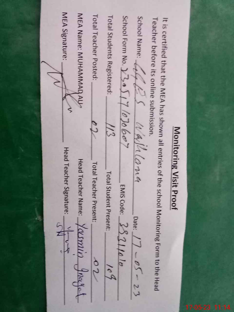 | Attendance Register | Head Teacher | MEA with School | Visit Proof |