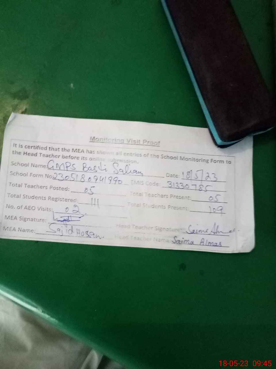 | Attendance Register | Head Teacher | MEA with School | Visit Proof |