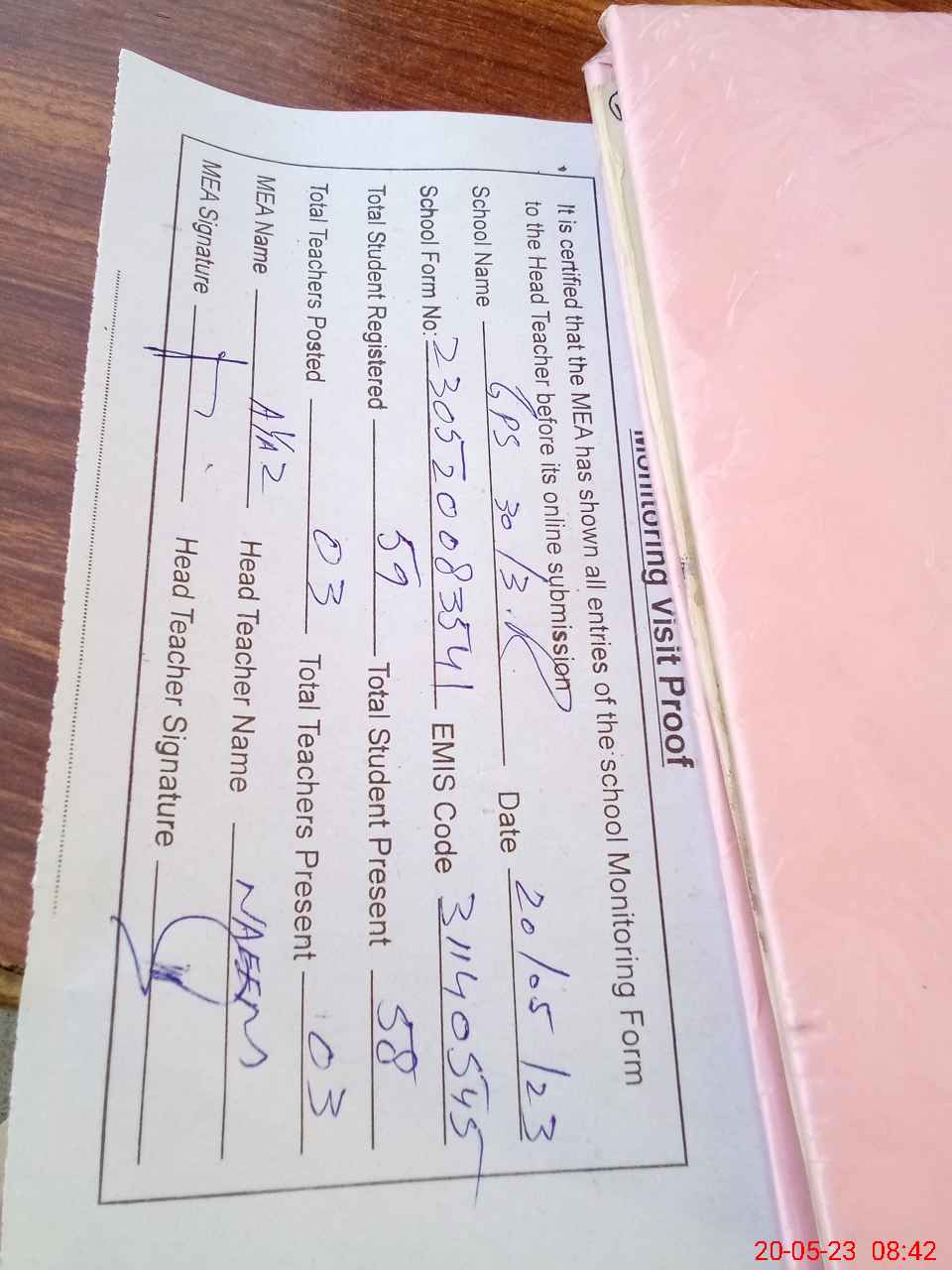 | Attendance Register | Head Teacher | MEA with School | Visit Proof |