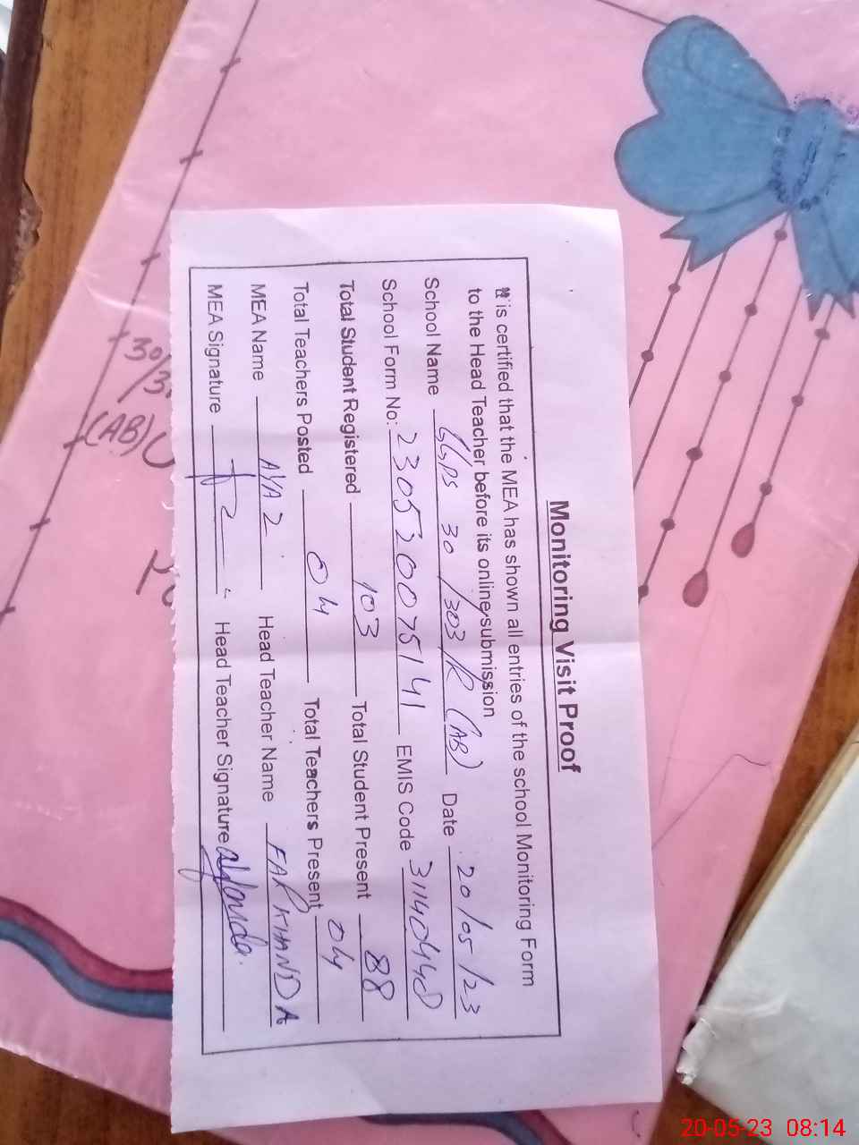 | Attendance Register | Head Teacher | MEA with School | Visit Proof |