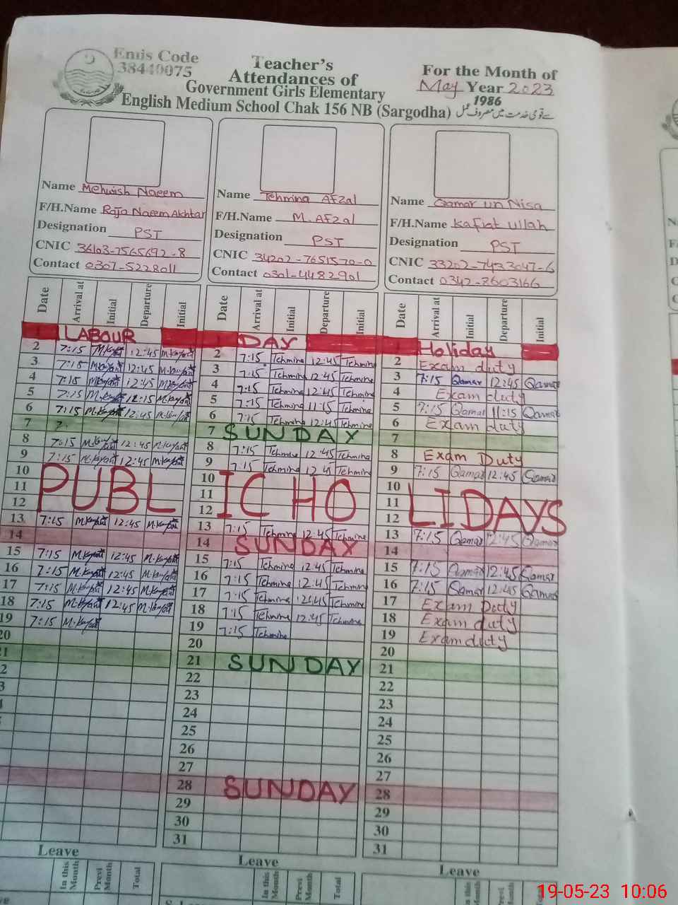 | CNIC | Full Name | Designation | R/C | Absence During Last Calender Month |