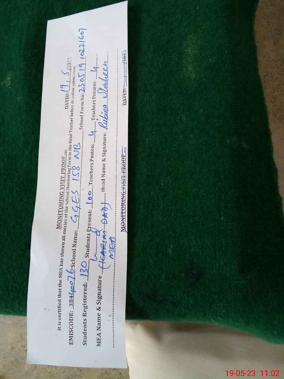| Attendance Register | Head Teacher | MEA with School | Visit Proof |