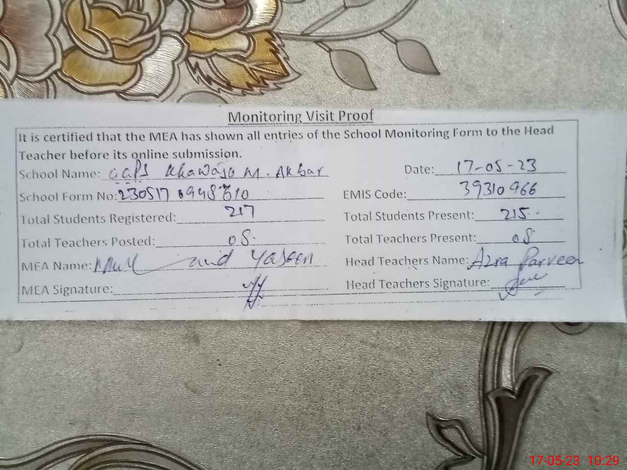 | Certified that this School was Inspected by the Undersigned MEA/DMO Today and the Information Stated Above is as Per Record. | |||||