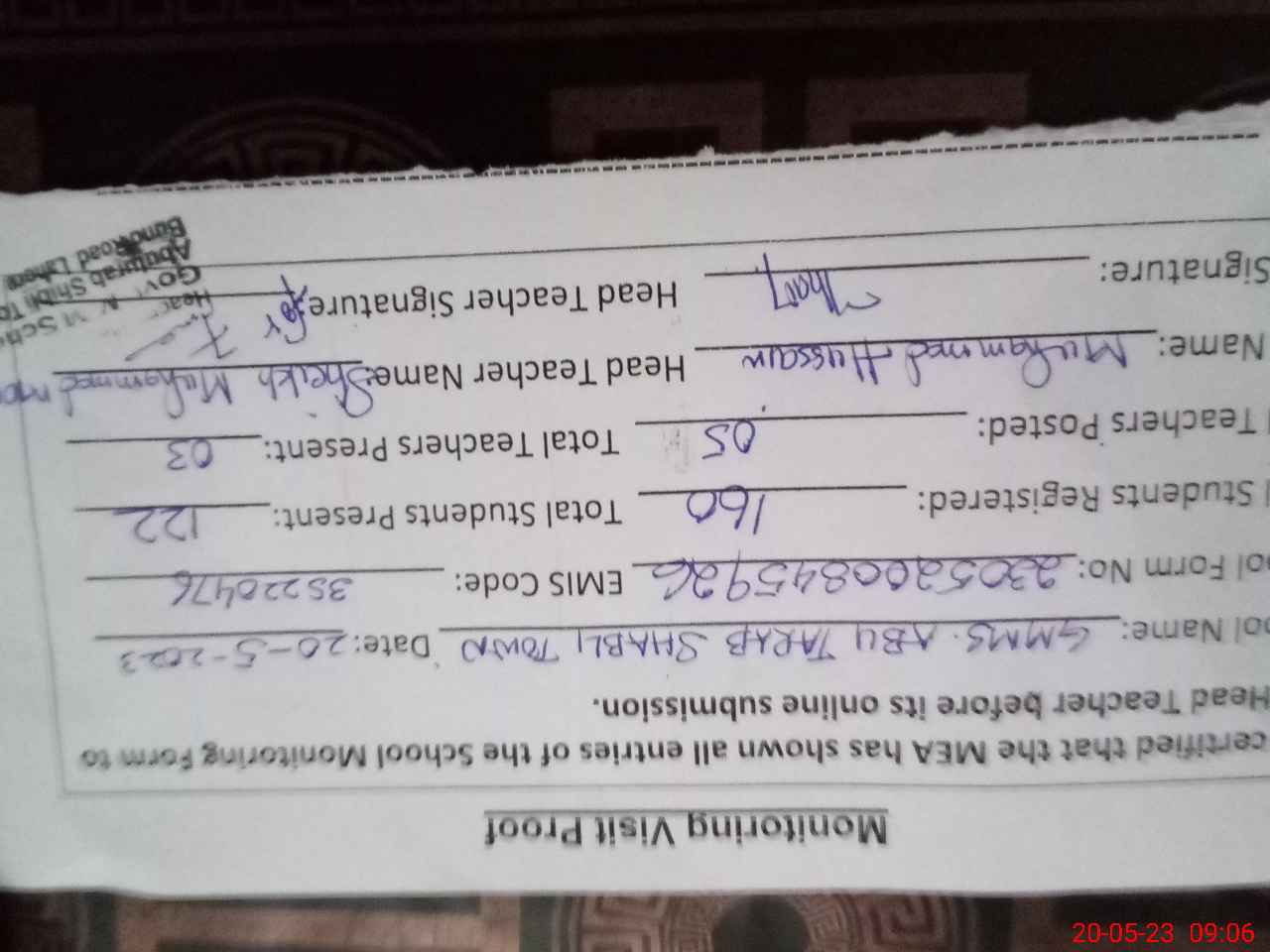 | Remarks (Use Separate Page if Required): Sheikh Mohammed Moghis pst teacher absent from duty since 19th January 2023 School functional in Mosque and two hall given to school No fund in school | |||||