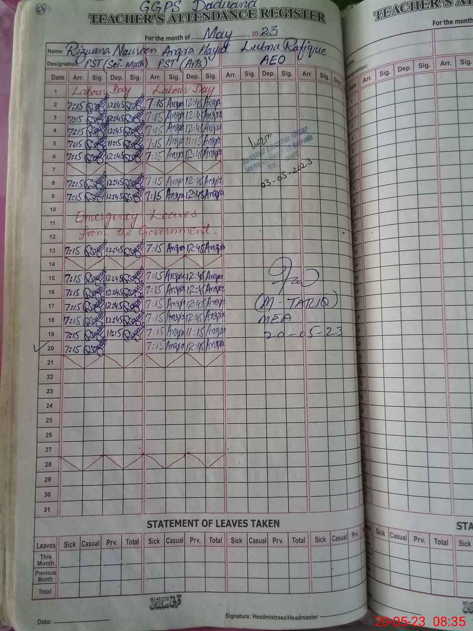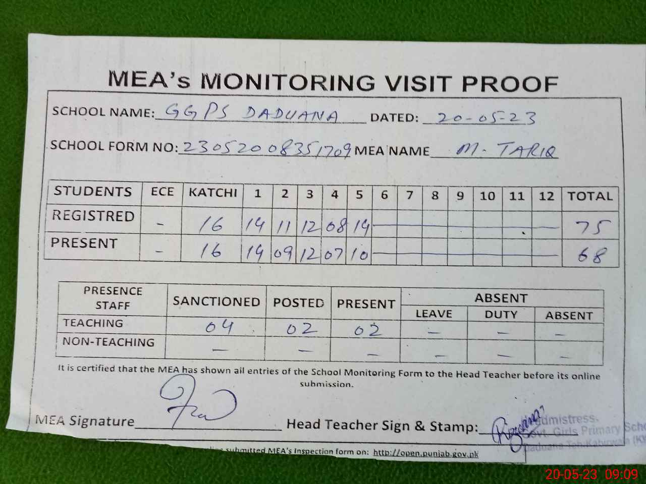 | Attendance Register | Head Teacher | MEA with School | Visit Proof |