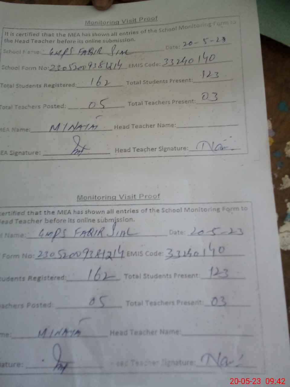 | Attendance Register | Head Teacher | MEA with School | Visit Proof |