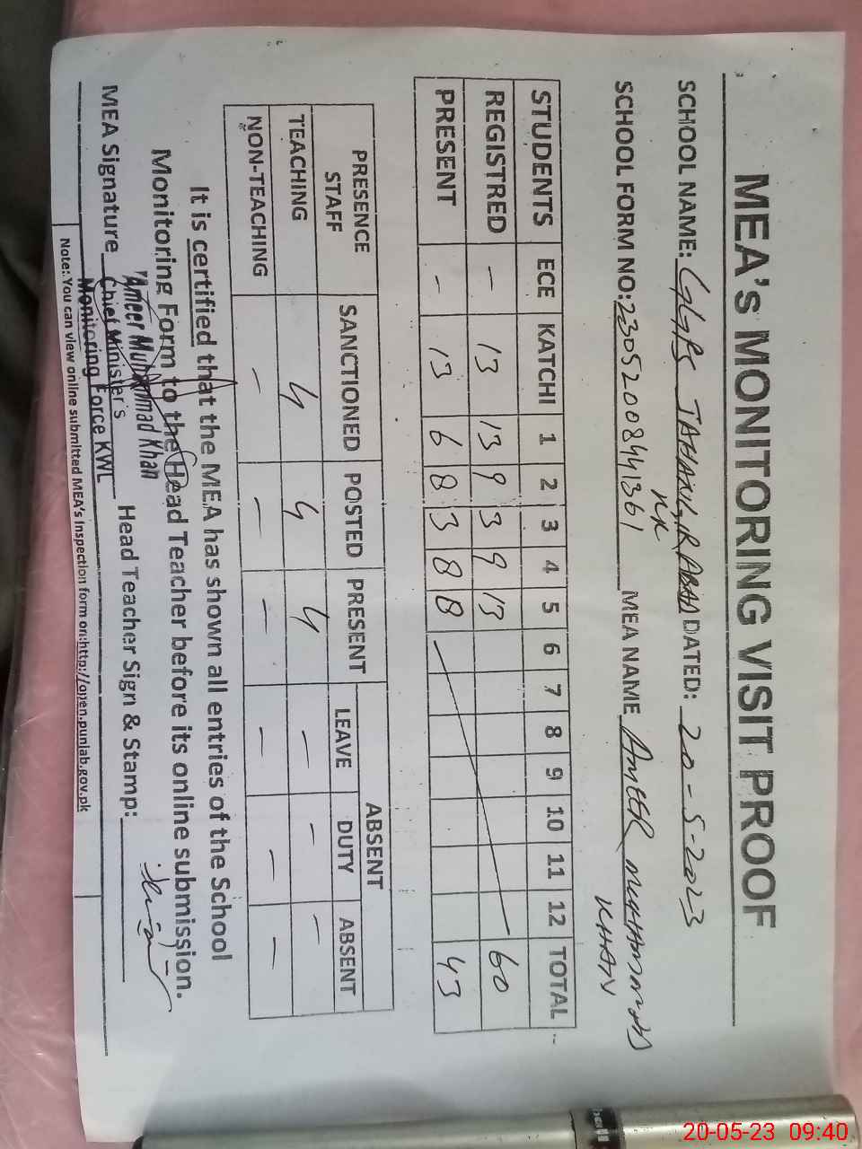 | Attendance Register | Head Teacher | MEA with School | Visit Proof |