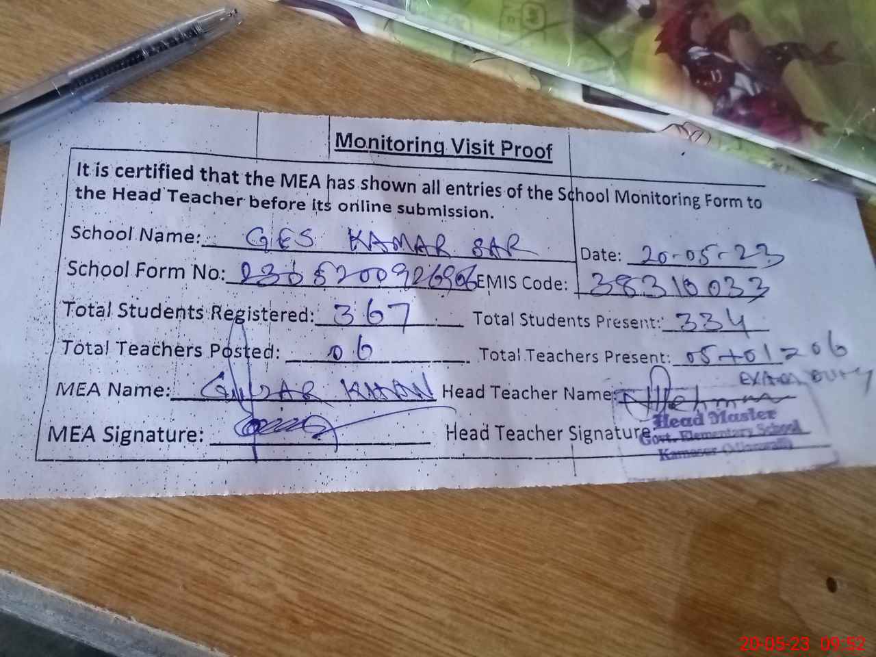 | Attendance Register | Head Teacher | MEA with School | Visit Proof |