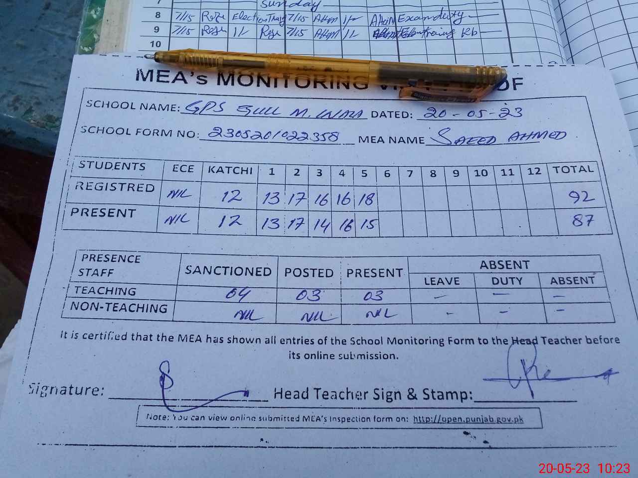 | Attendance Register | Head Teacher | MEA with School | Visit Proof |