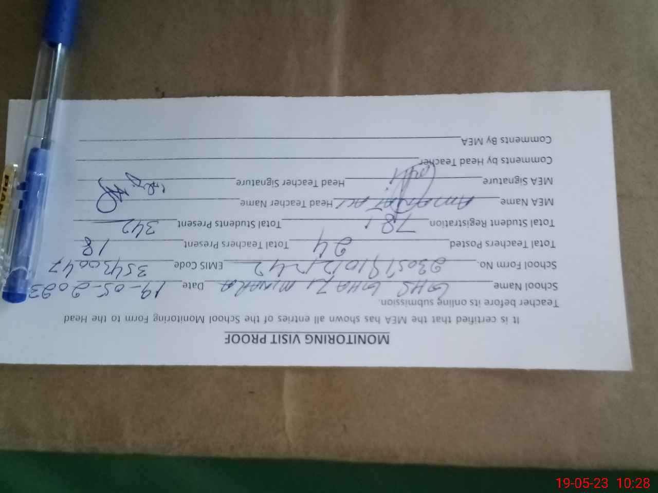 | Attendance Register | Head Teacher | MEA with School | Visit Proof |