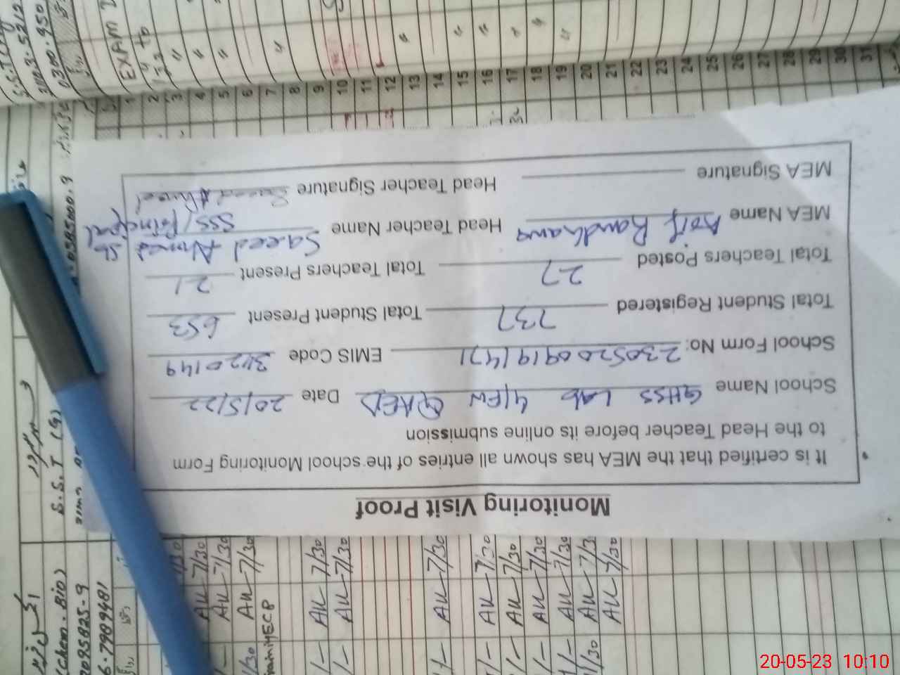 | Attendance Register | Head Teacher | MEA with School | Visit Proof |