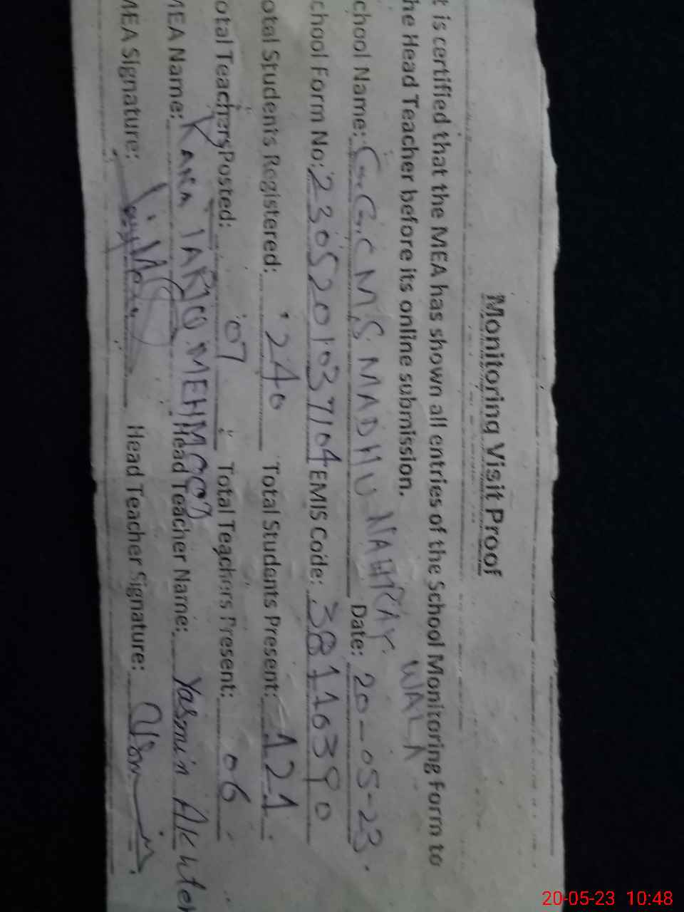| Attendance Register | Head Teacher | MEA with School | Visit Proof |