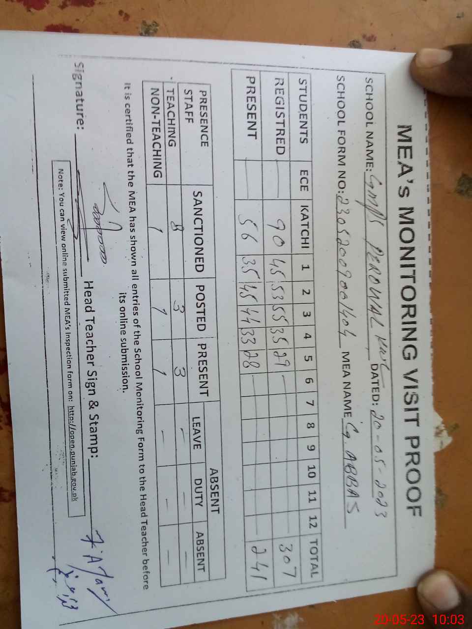 | Attendance Register | Head Teacher | MEA with School | Visit Proof |