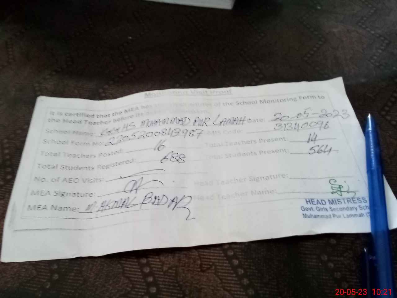 | Certified that this School was Inspected by the Undersigned MEA/DMO Today and the Information Stated Above is as Per Record. | |||||