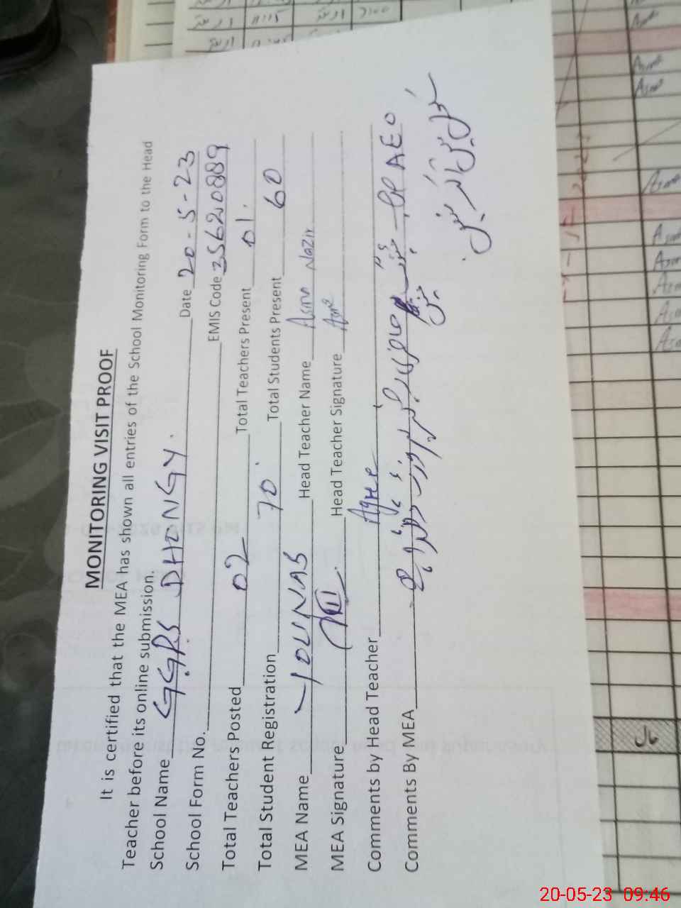 | Attendance Register | Head Teacher | MEA with School | Visit Proof |