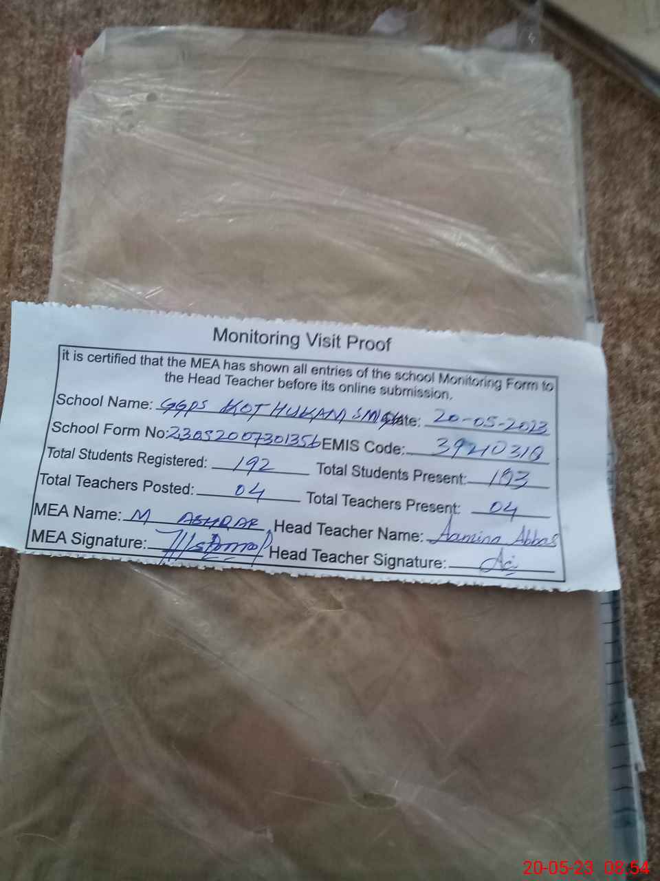 | Attendance Register | Head Teacher | MEA with School | Visit Proof |