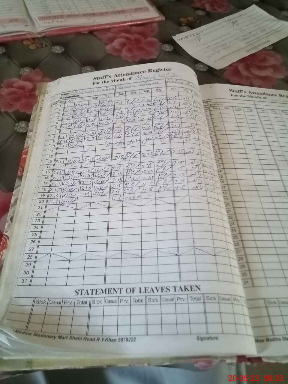 | CNIC | Full Name | Designation | R/C | Absence During Last Calender Month |