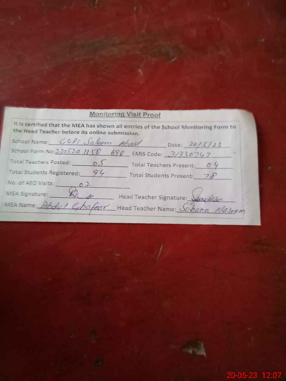 | Attendance Register | Head Teacher | MEA with School | Visit Proof |