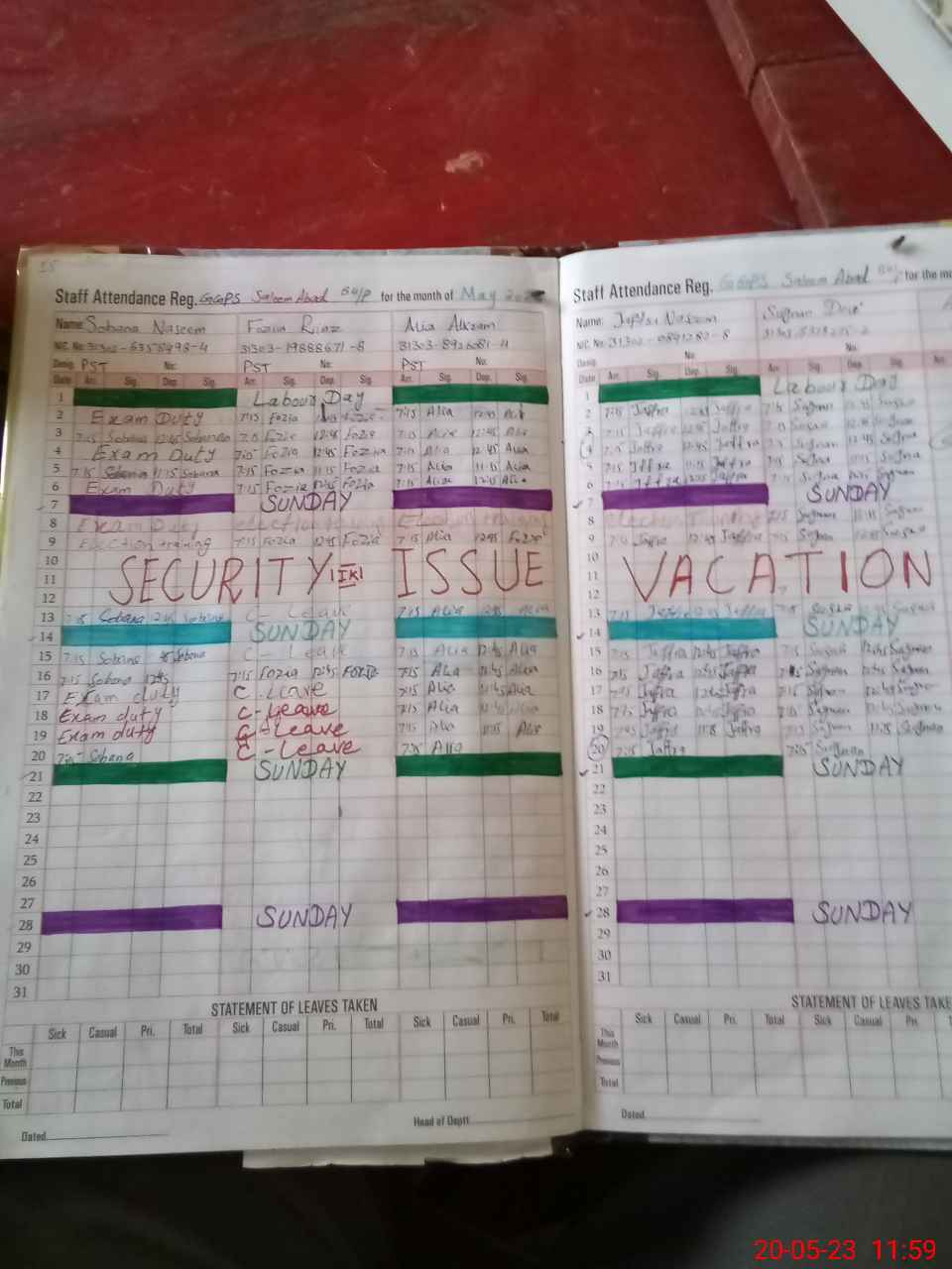 | CNIC | Full Name | Designation | R/C | Absence During Last Calender Month |