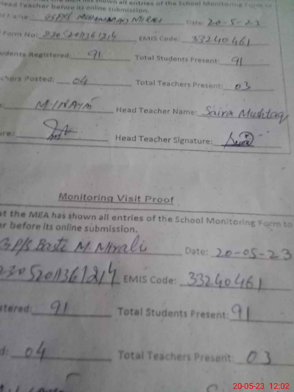 | Attendance Register | Head Teacher | MEA with School | Visit Proof |
