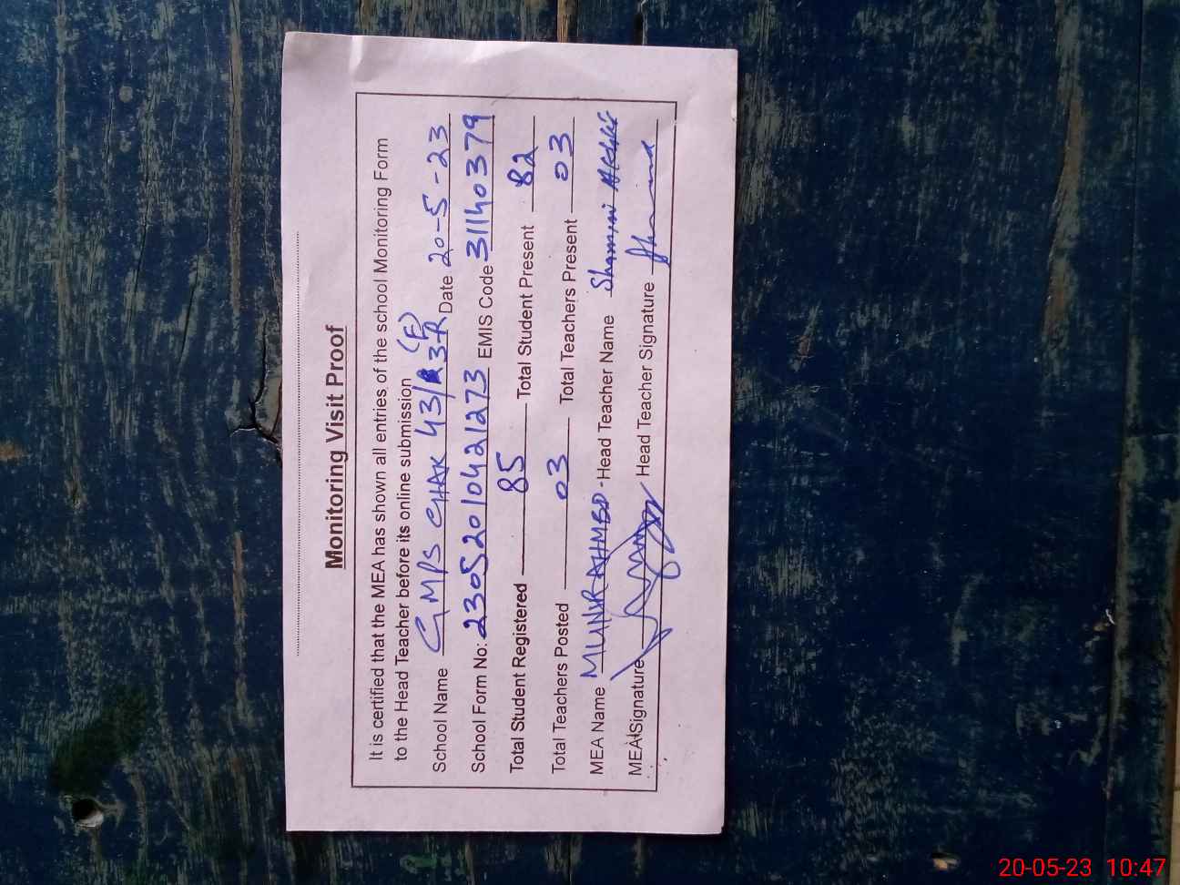 | Attendance Register | Head Teacher | MEA with School | Visit Proof |