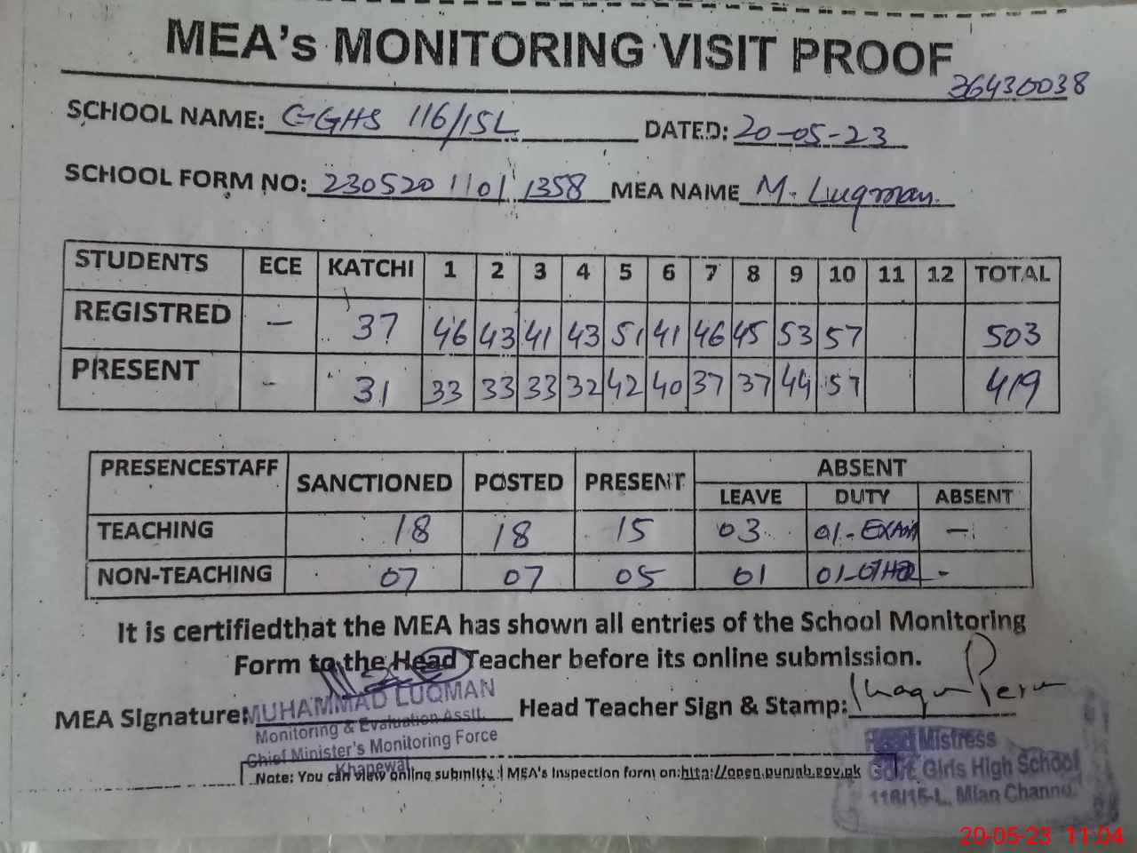 | Attendance Register | Head Teacher | MEA with School | Visit Proof |