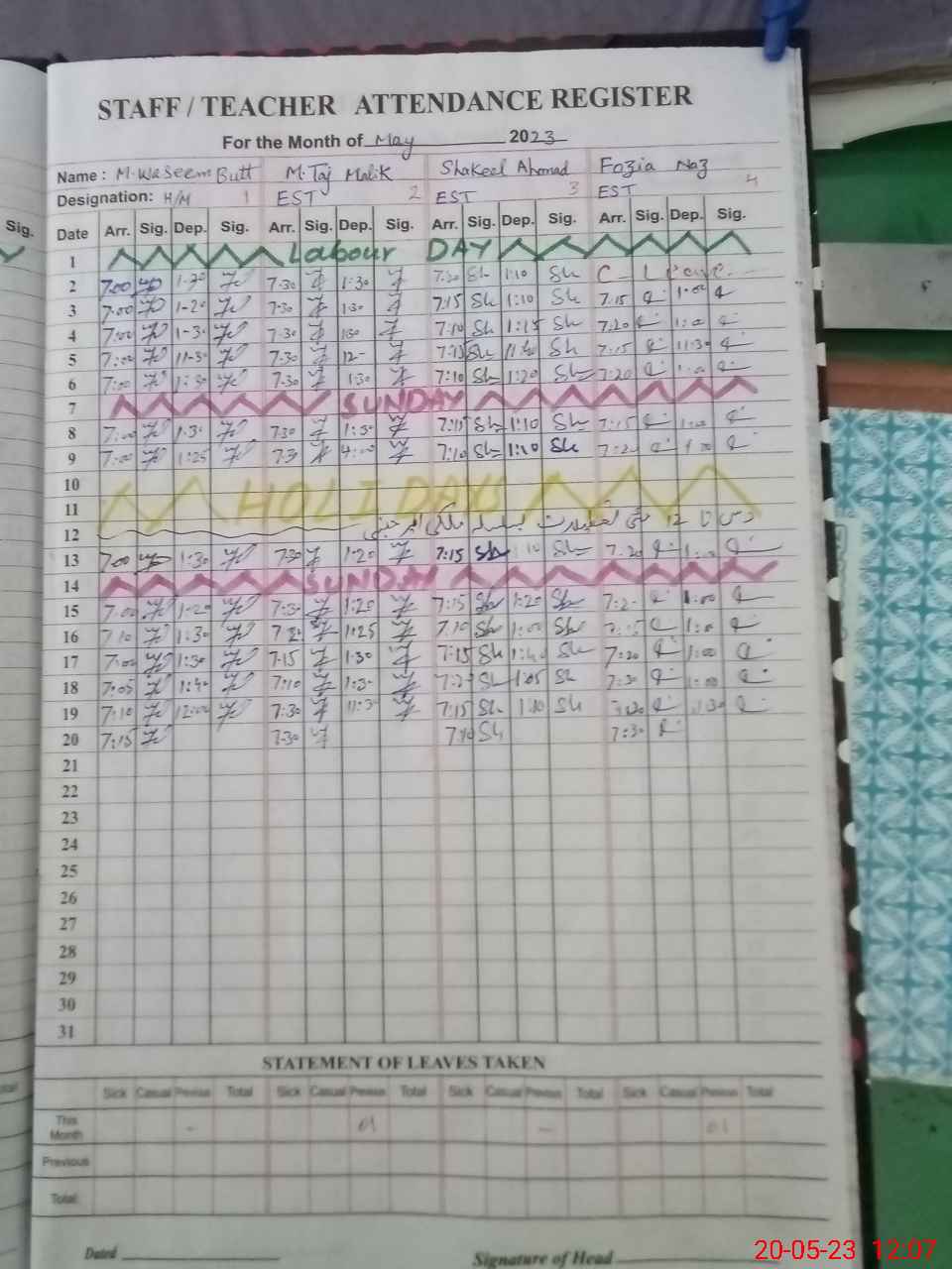 | Leave | Duty | Absent | Maternity | Medical | Ex- Pak | Study | Earned | Casual | |||||