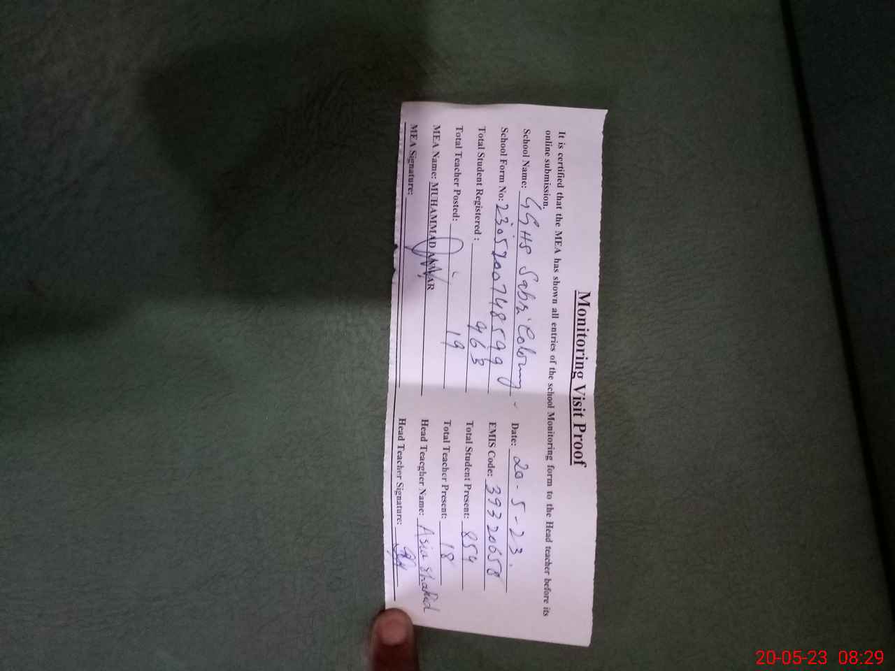 | Attendance Register | Head Teacher | MEA with School | Visit Proof |