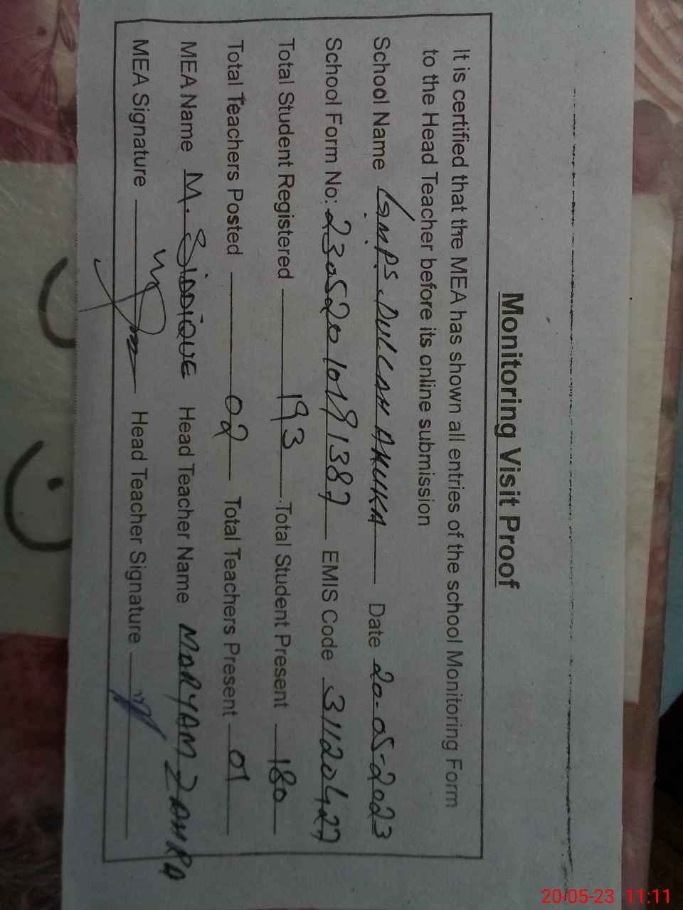 | Attendance Register | Head Teacher | MEA with School | Visit Proof |