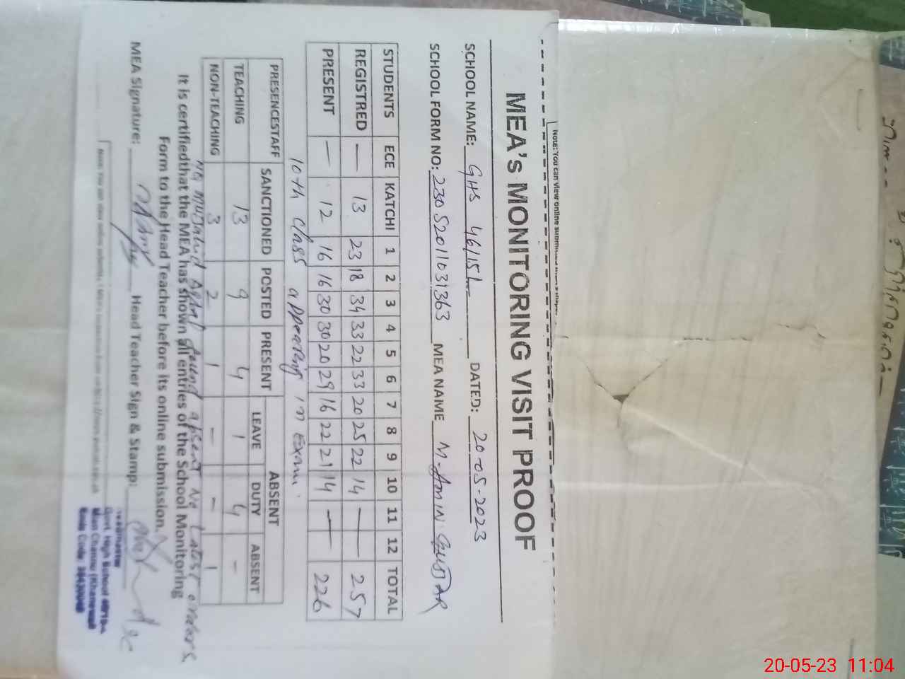 | Attendance Register | Head Teacher | MEA with School | Visit Proof |
