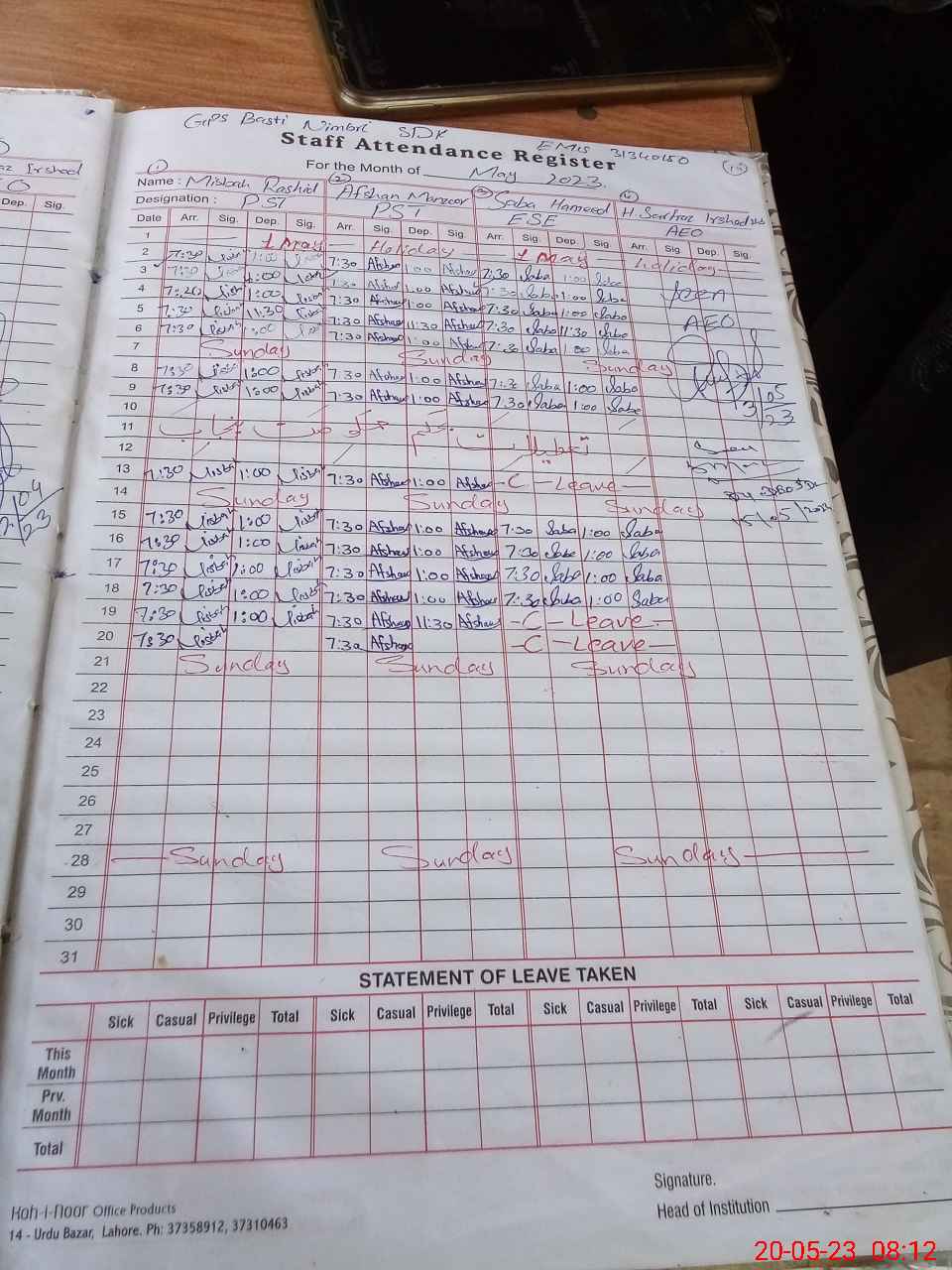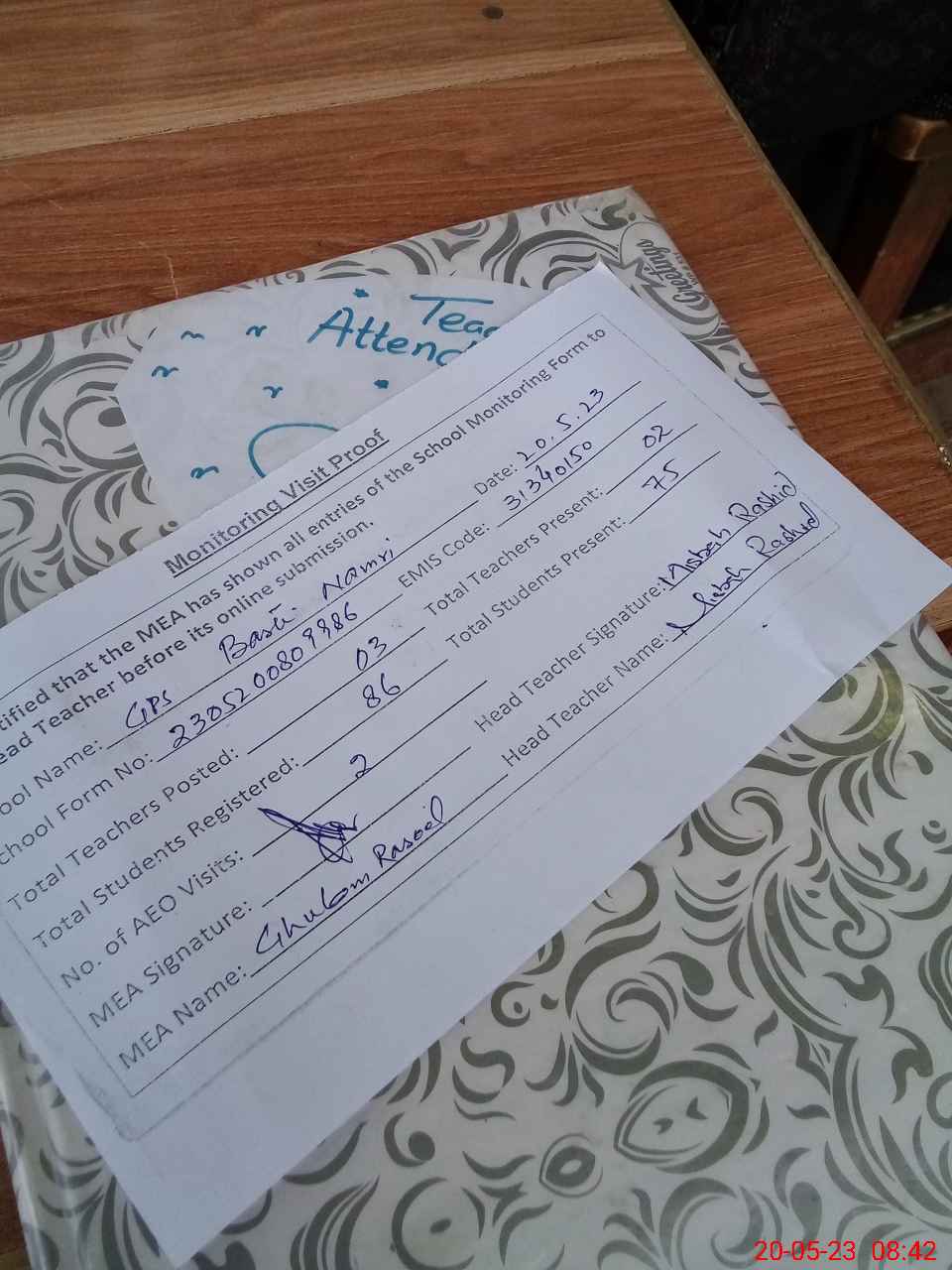 | Attendance Register | Head Teacher | MEA with School | Visit Proof |