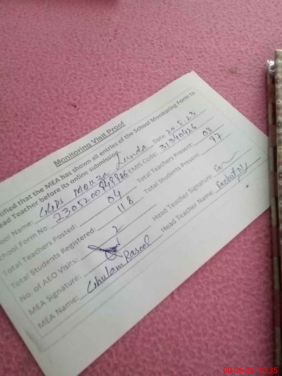 | Attendance Register | Head Teacher | MEA with School | Visit Proof |