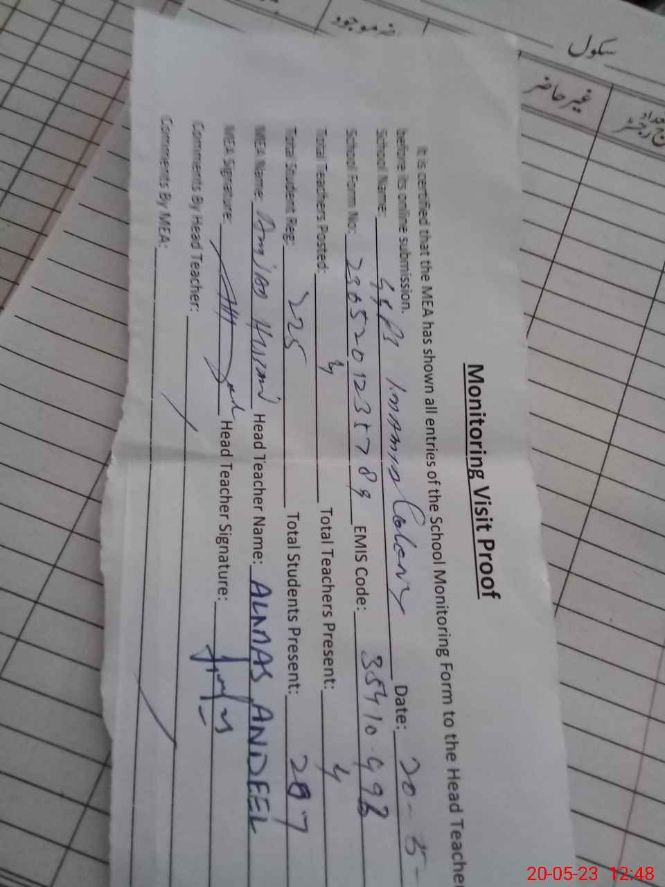 | Attendance Register | Head Teacher | MEA with School | Visit Proof |
