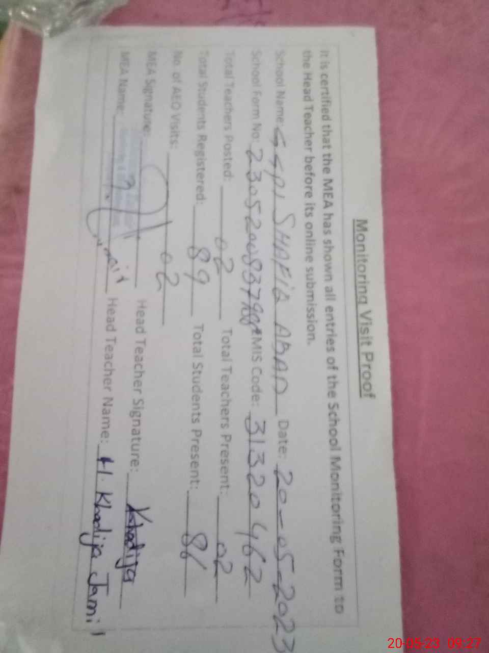 | Attendance Register | Head Teacher | MEA with School | Visit Proof |