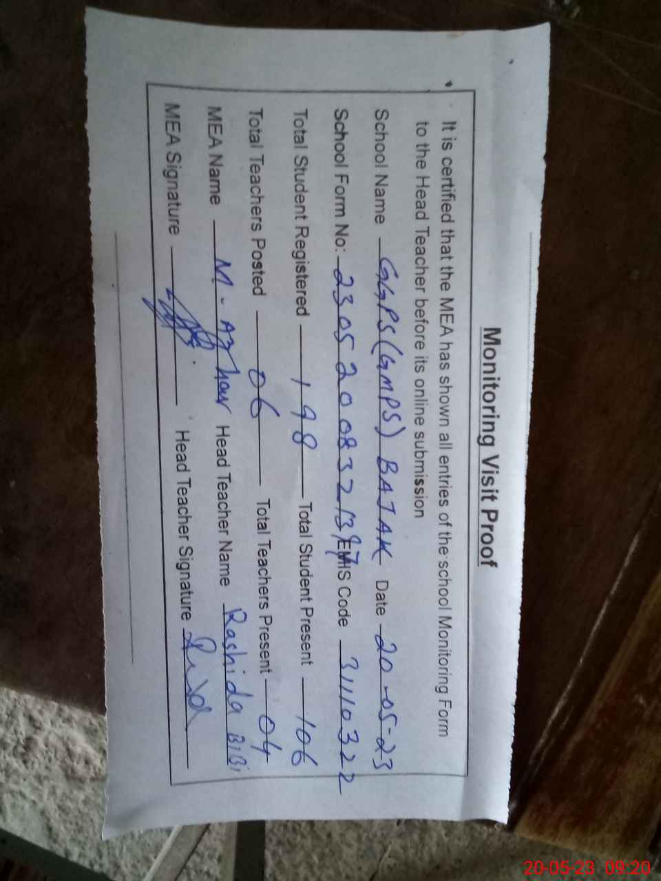 | Attendance Register | Head Teacher | MEA with School | Visit Proof |